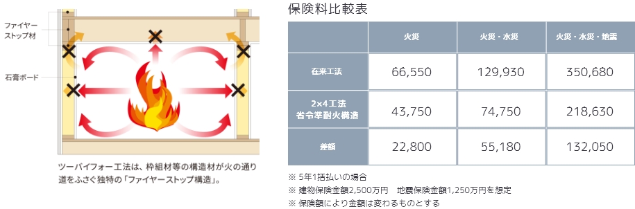 ツーバイフォー工法は、火の通りとなる、床・壁において、枠組材などが、ファイヤーストップ材となって、空気の流れを遮断し、上階への、火の燃え広がりを防止します。省令準耐火構造に該当し、火災保険料率に反映されています。