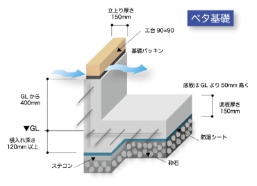 基礎と土台の間には、基礎パッキンによる、優れた換気性能が、湿気を除去し、基礎と建物の劣化を防ぎます。