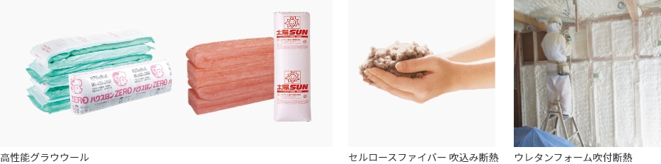 省エネ性のあるツーバイフォー構造に採用する断熱材は、高性能グラスウール・現場吹付発砲断熱材・セルロースファイバー乾式吹込み断熱のいずれかの断熱材をお選び頂きます。
