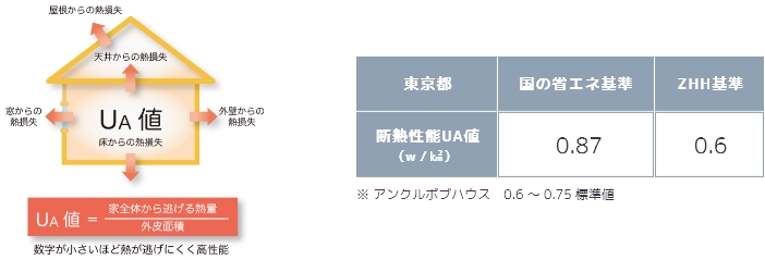 UA値とは、【外皮平均熱貫流率】の事を指す値で、どのくらいの熱量が外に逃げたかを表す数値で、住宅全体の断熱性能を数値で表した指標です。数値が小さい程、断熱性能が高い住宅となります。