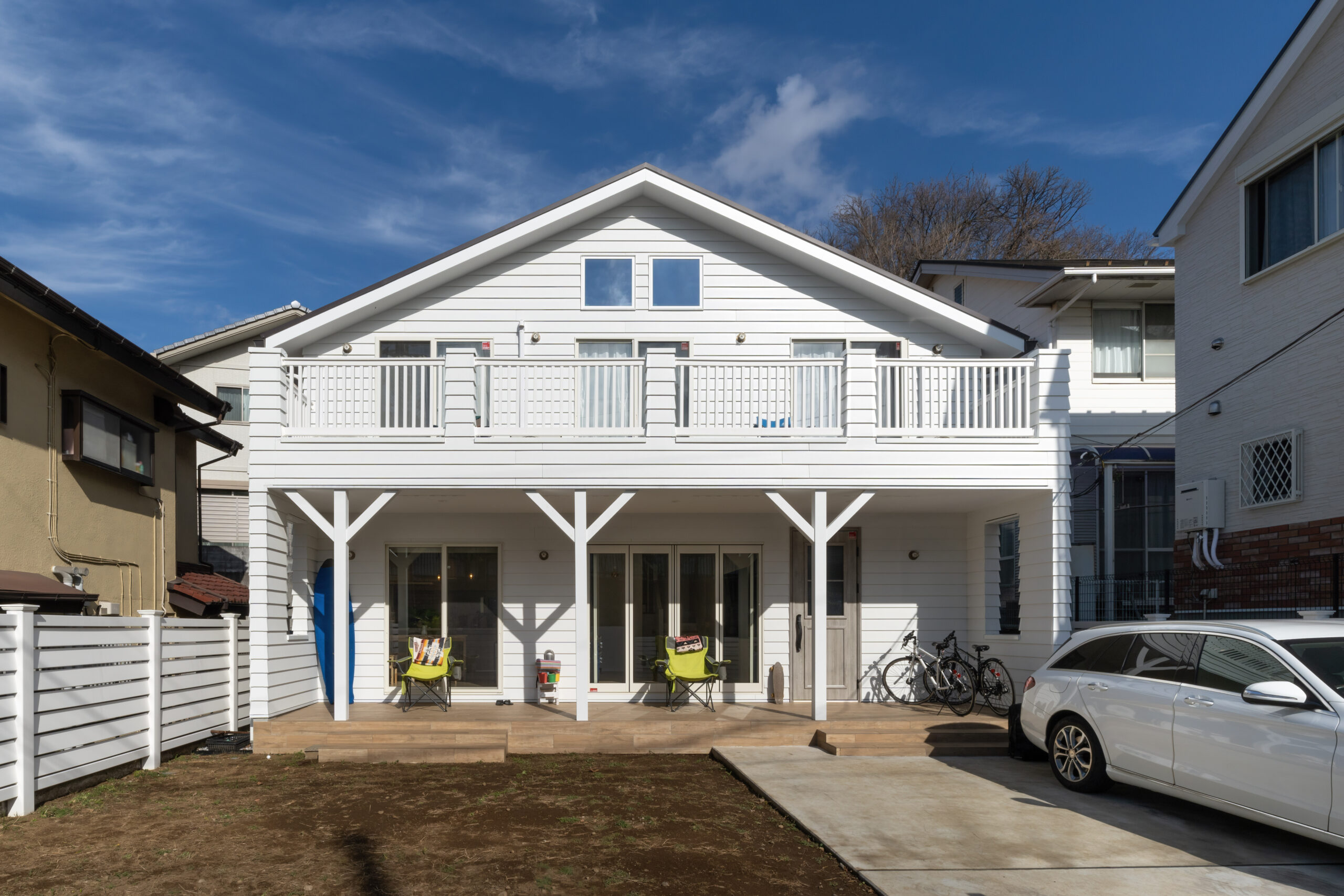 さまざまな使い方ができる広いベランダを模索した結果、ポーチ部の日除けは屋根ではなくバルコニーを設置することに。