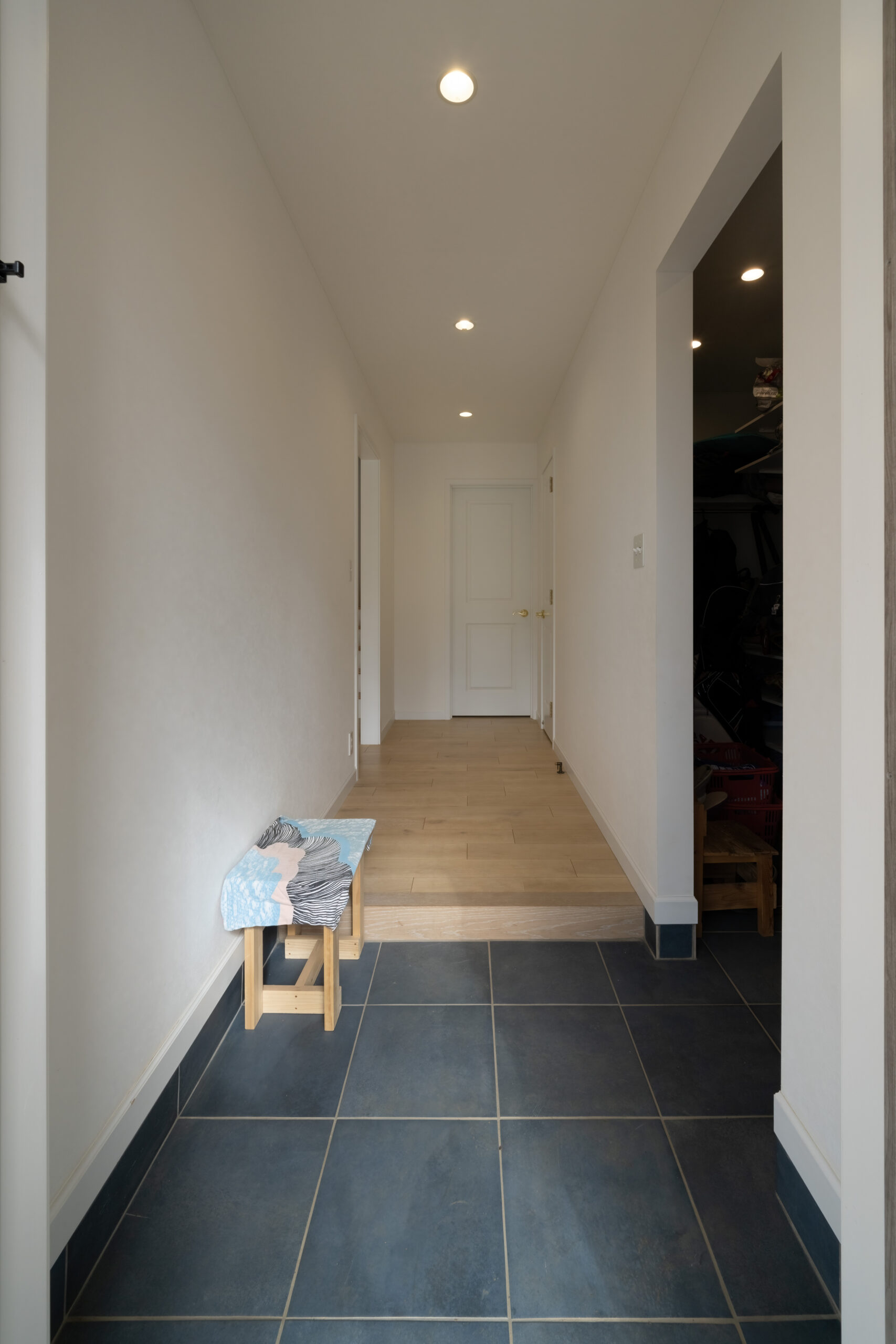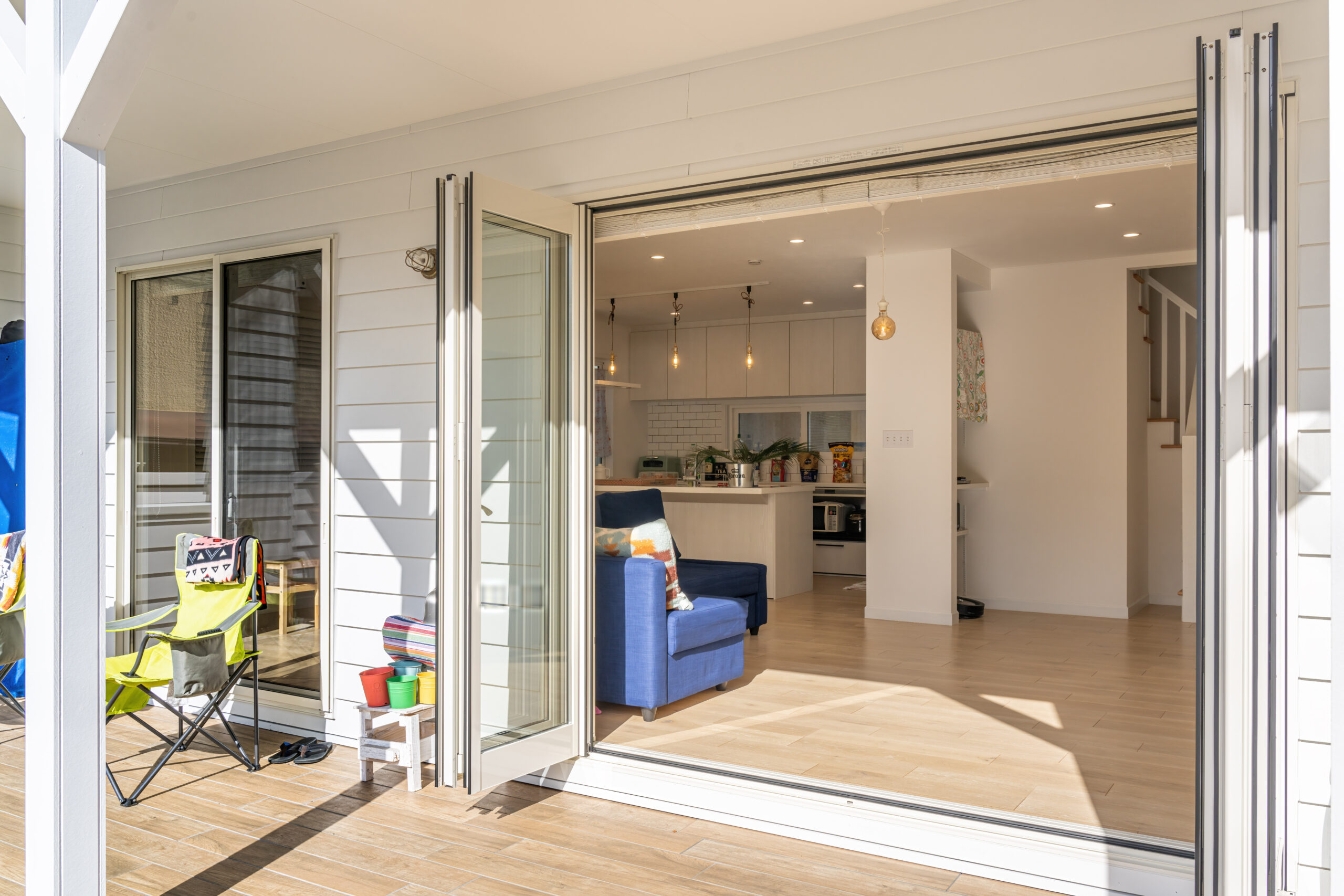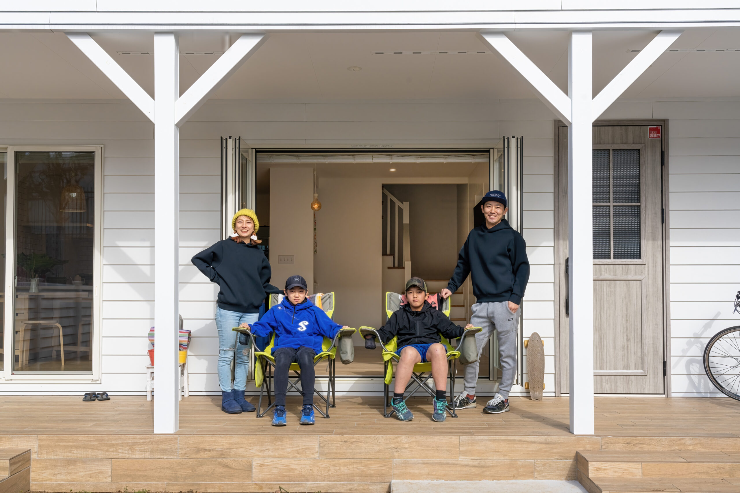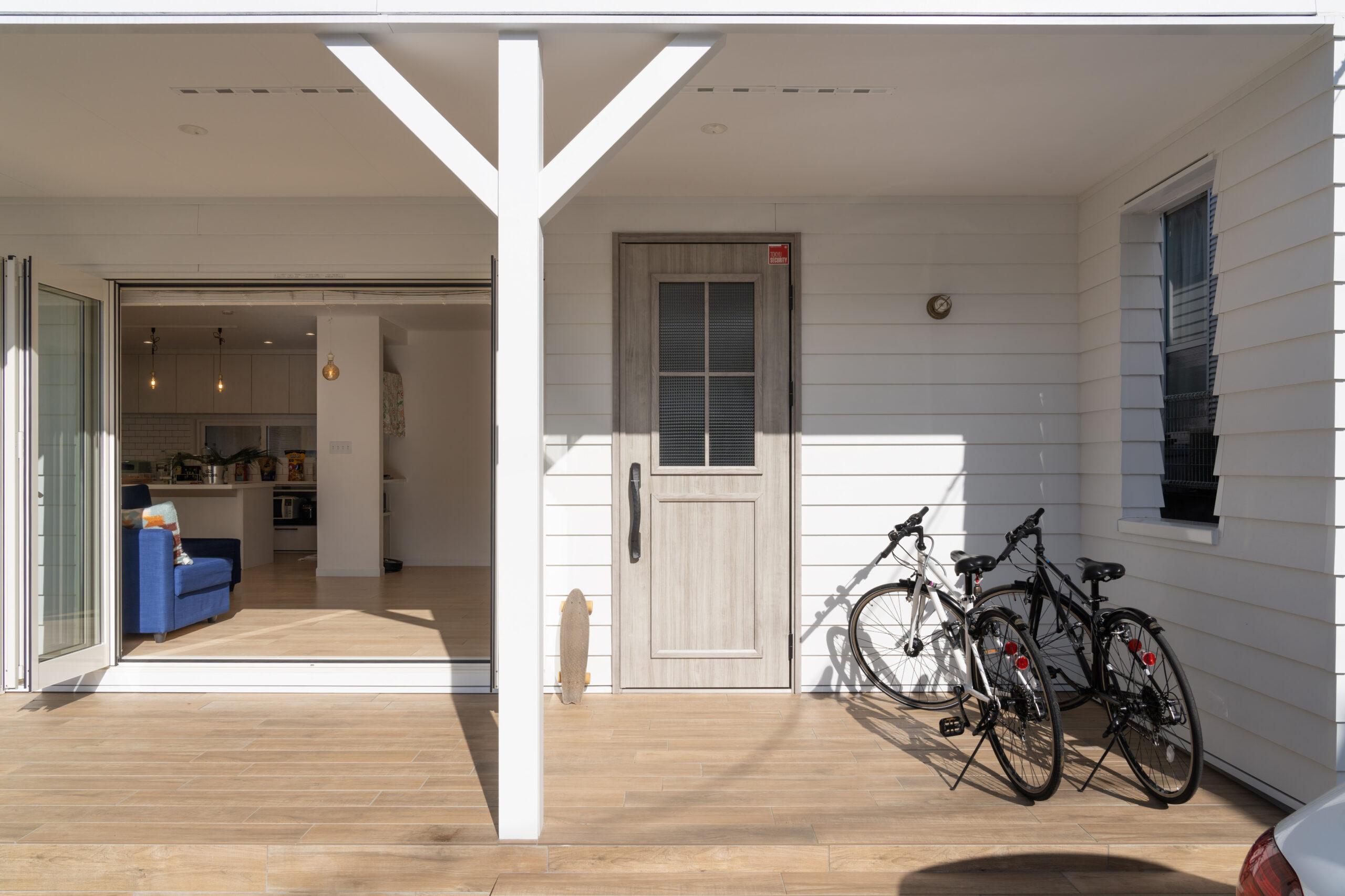 リビングと繋がるポーチも、広々としたスペースを確保しています。床材は雨風に強くメンテナンスフリーのタイル床を採用。木目調のデザインが白い外観の住まいとマッチして、優しい印象です。