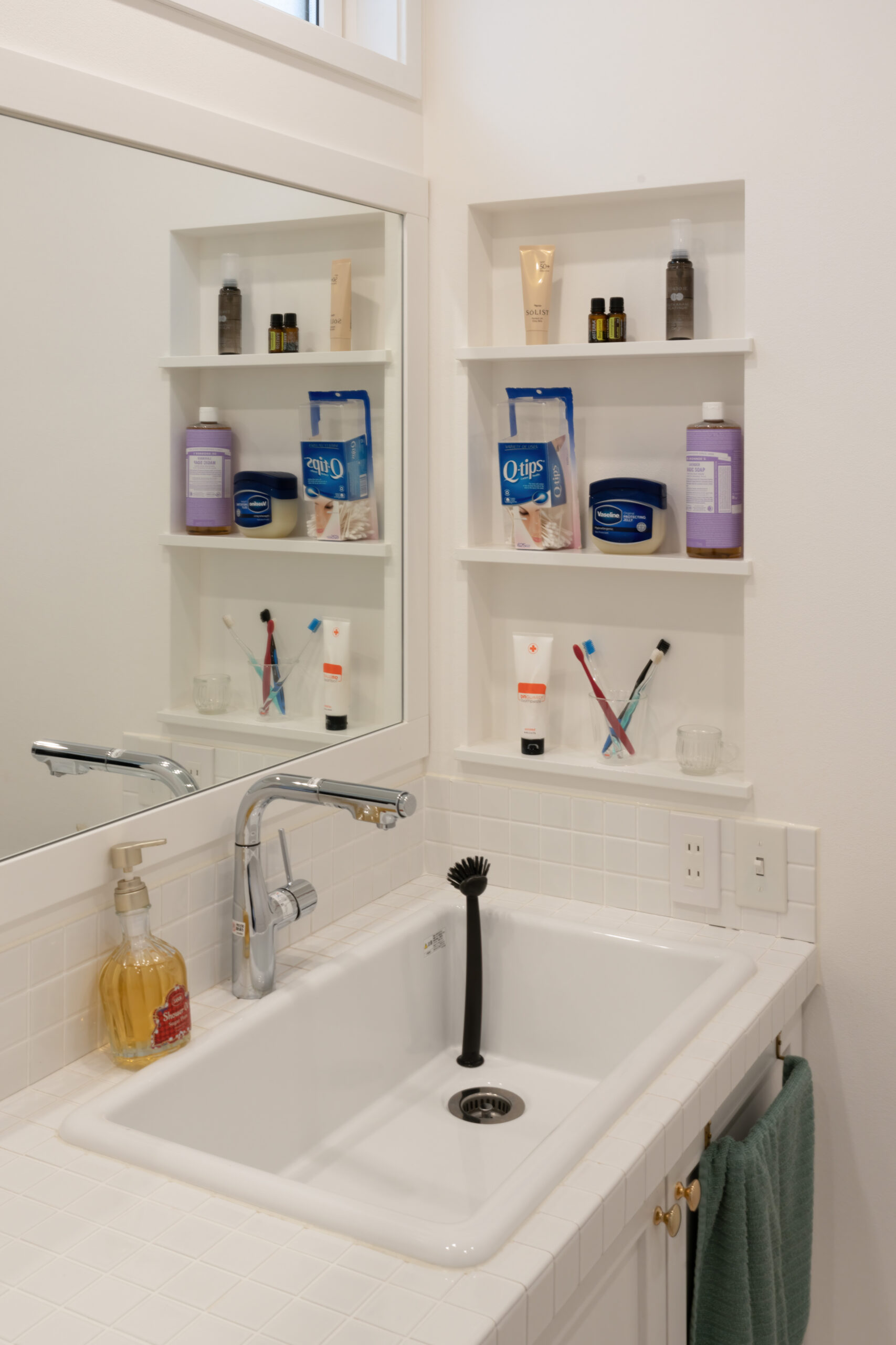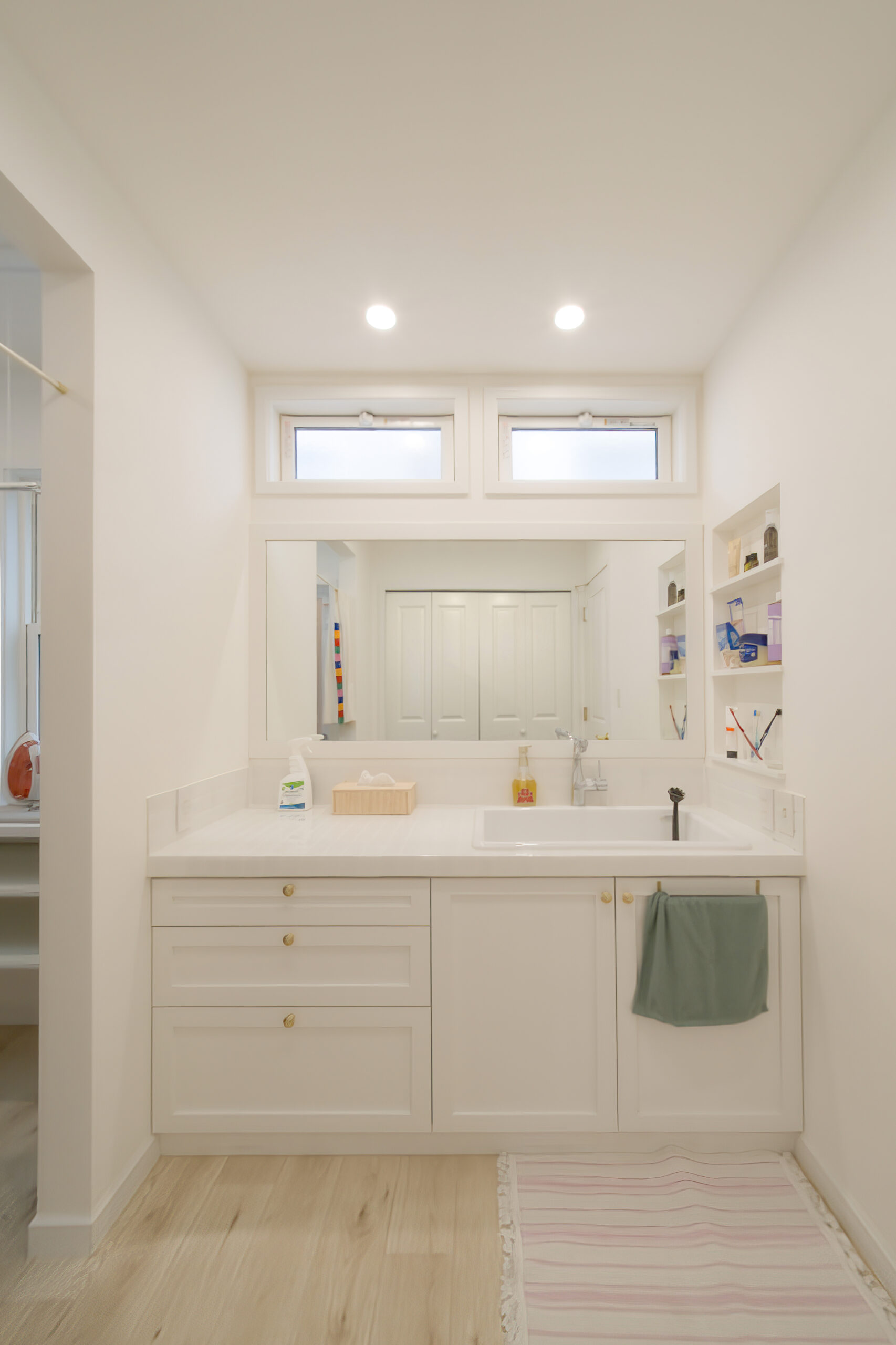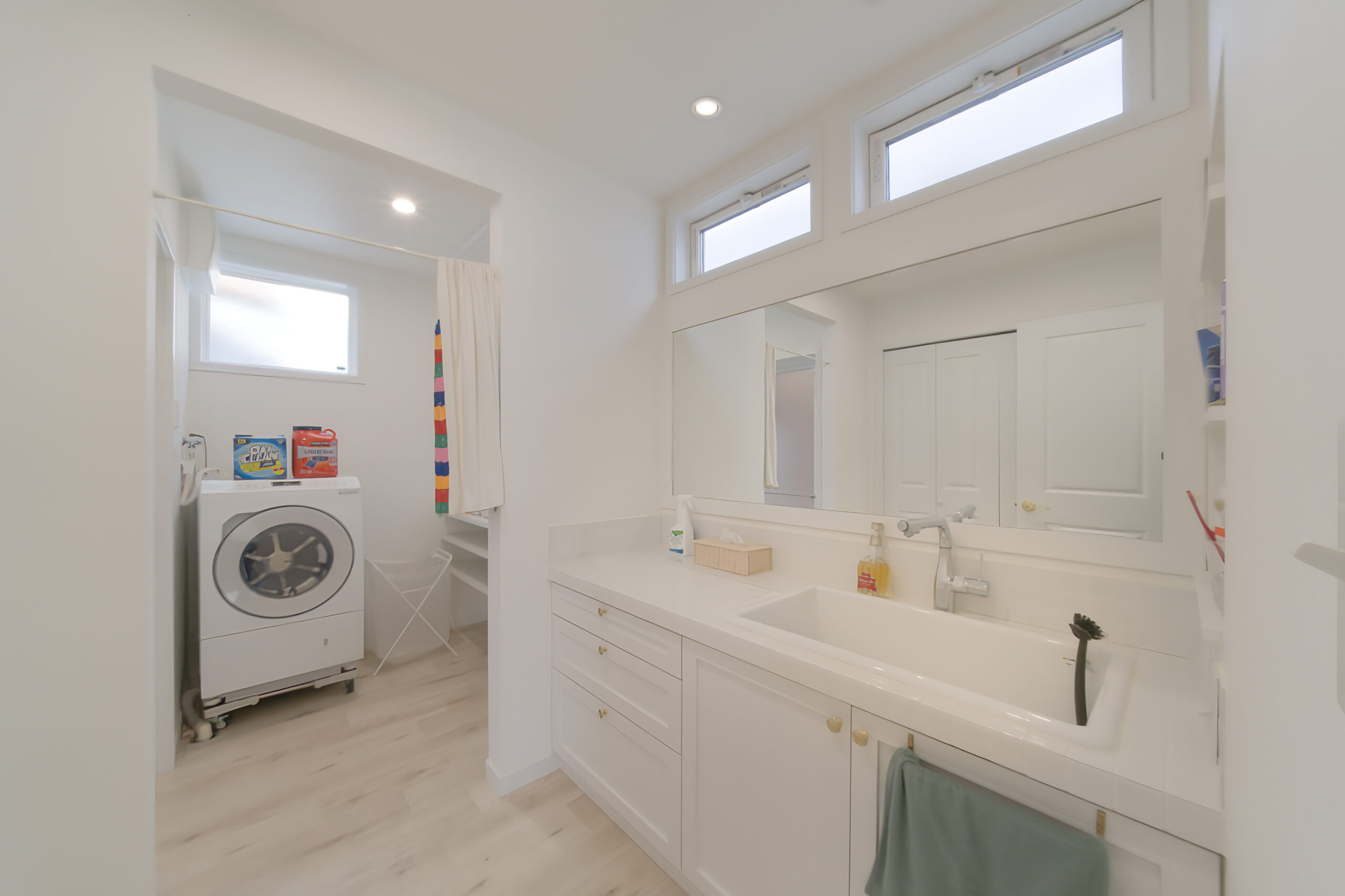 洗面台の壁を広く埋める鏡は、家族並んで身仕度をする際に重宝します。また、壁面収納はあえて扉をつけないことで、身仕度に必要な動線を短縮。効率性に優れた、洗面所が完成しました。