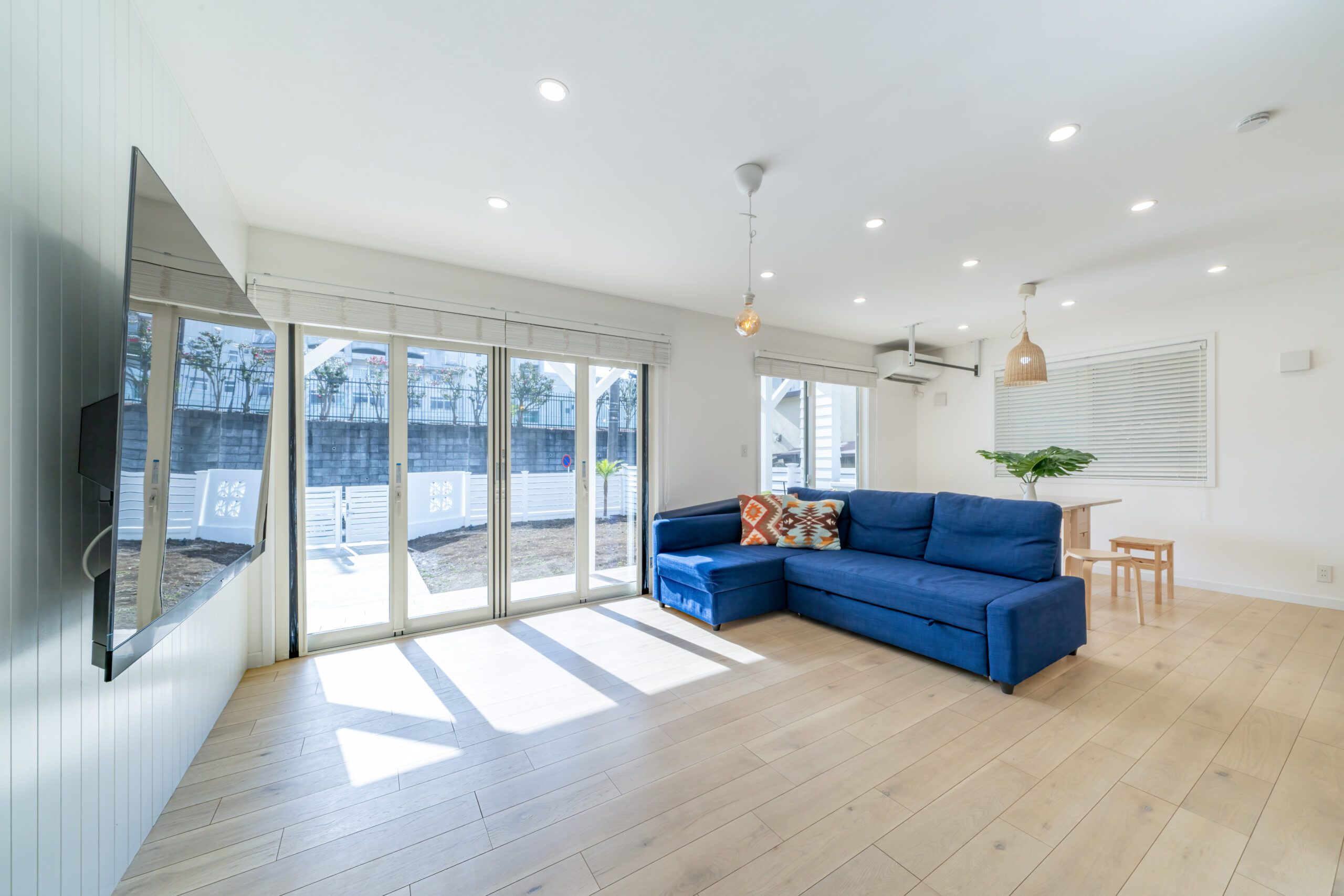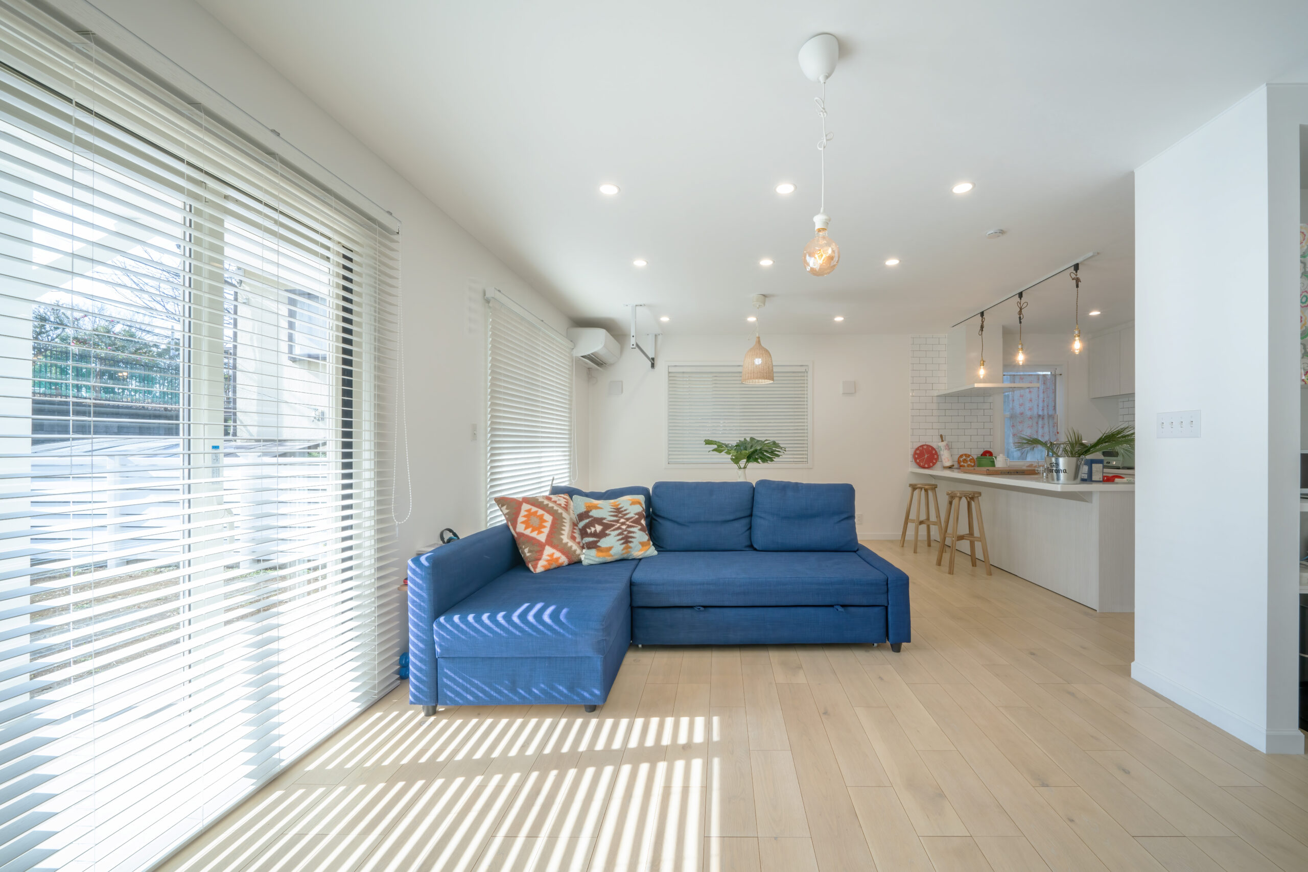Livingに入ると、ホワイトの中にも、このお家のアクセントカラーのネオビーのソファーが目に留まります。