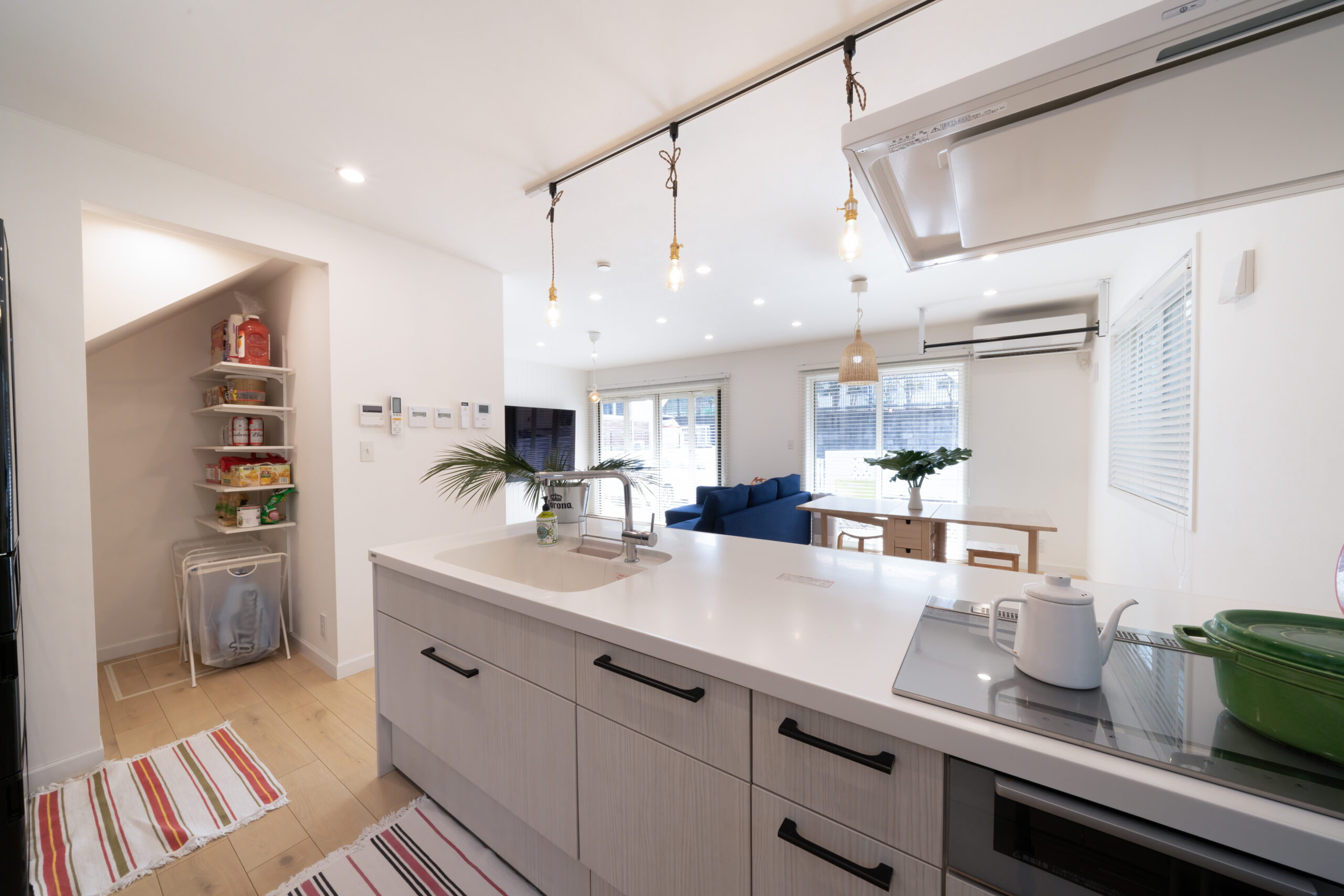 階段下スペースは、パントリーとして活用しています。キッチンへの動線に無駄がなく、空間を効率的に使ったアイデアです。