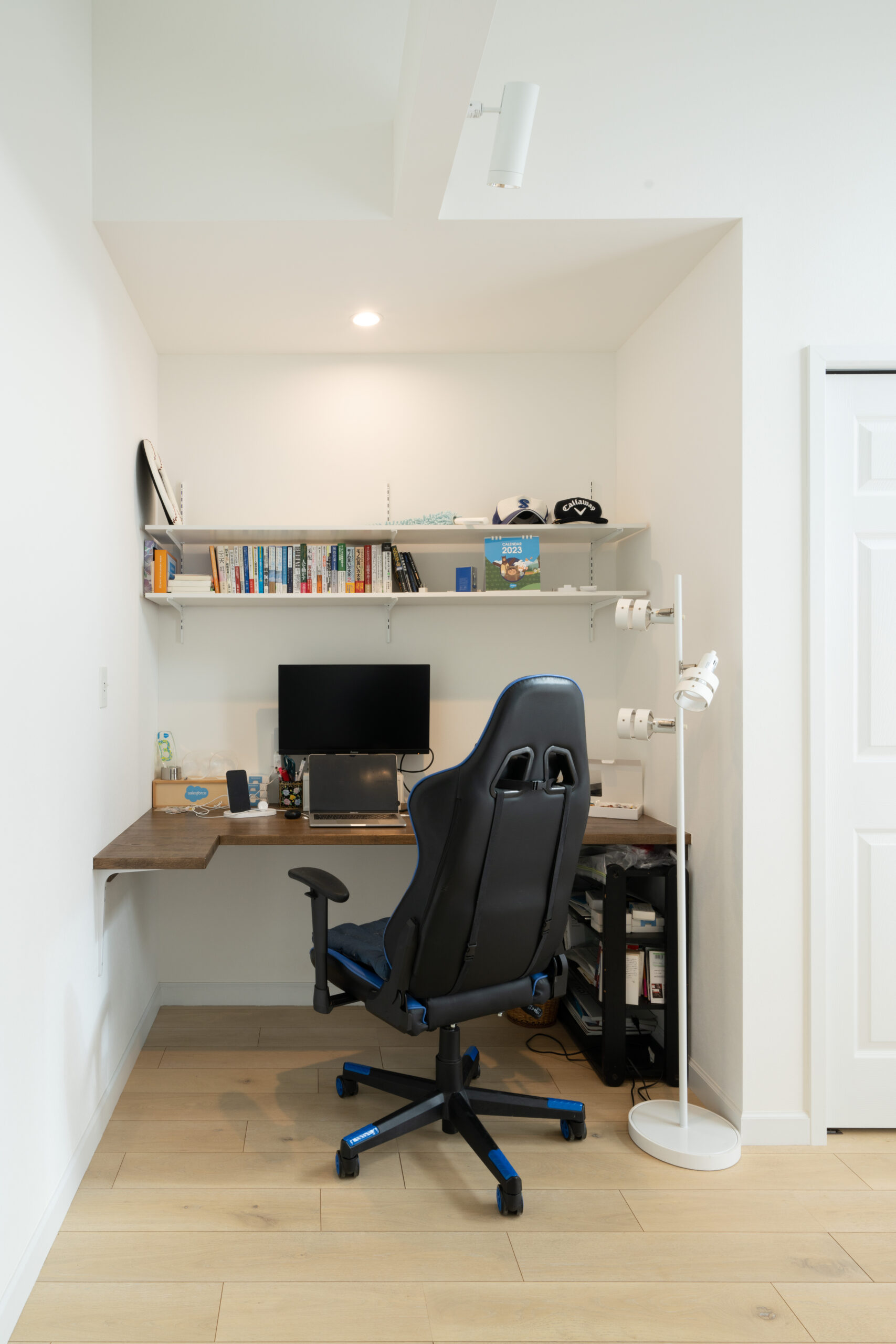 リモートのお仕事が増えたご主人。収納の横には、ワーキングスペースを設置しました。L字型のテーブルにすることで、広い作業スペースを確保できます。