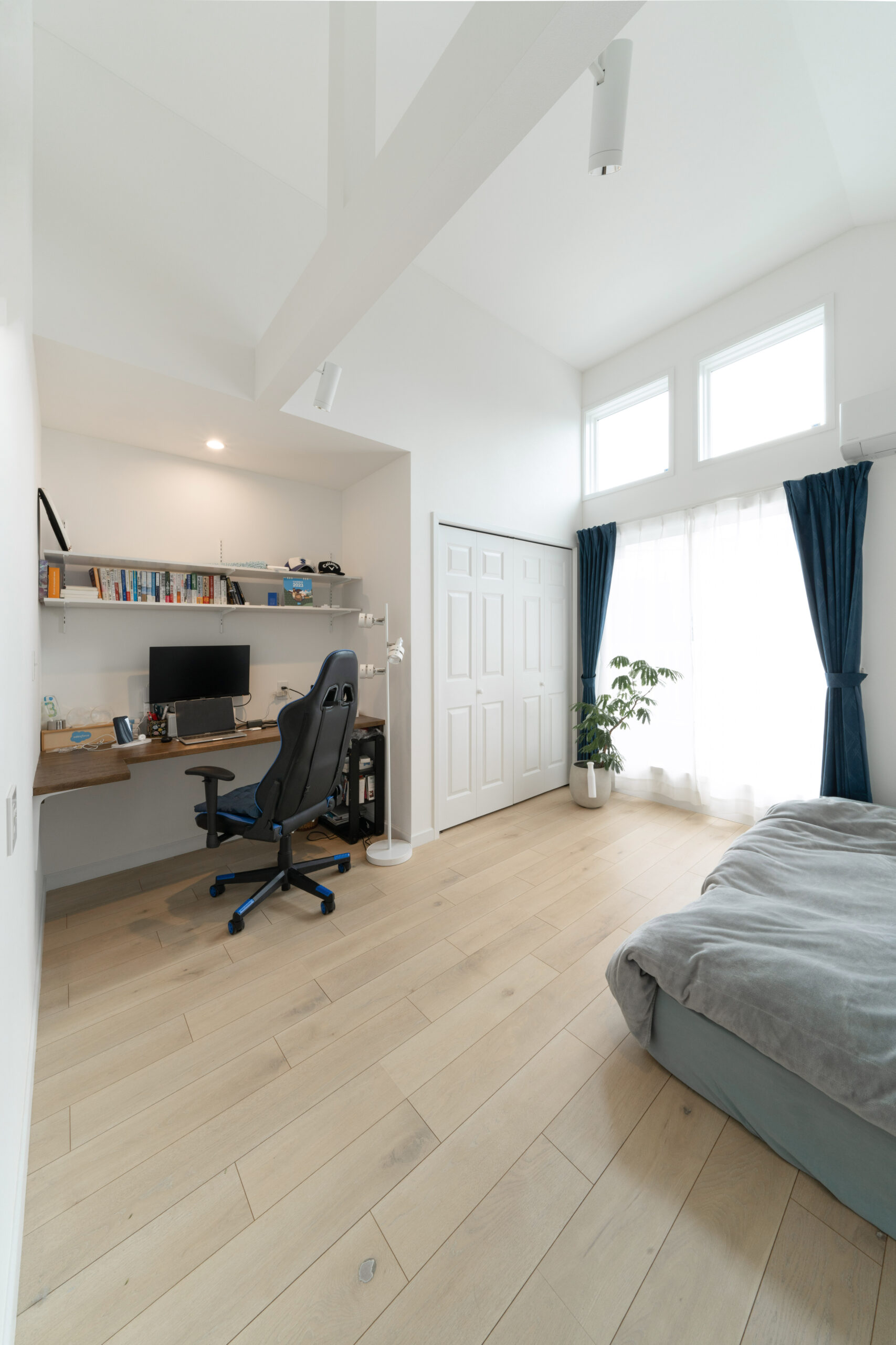 こちらは、ご主人の寝室です。吹き抜けとなっており天井が高いことから、開放的なイメージとなっています。収納扉はメソナイト輸入ドアを現場塗装を施し、空間に高級感をプラス。