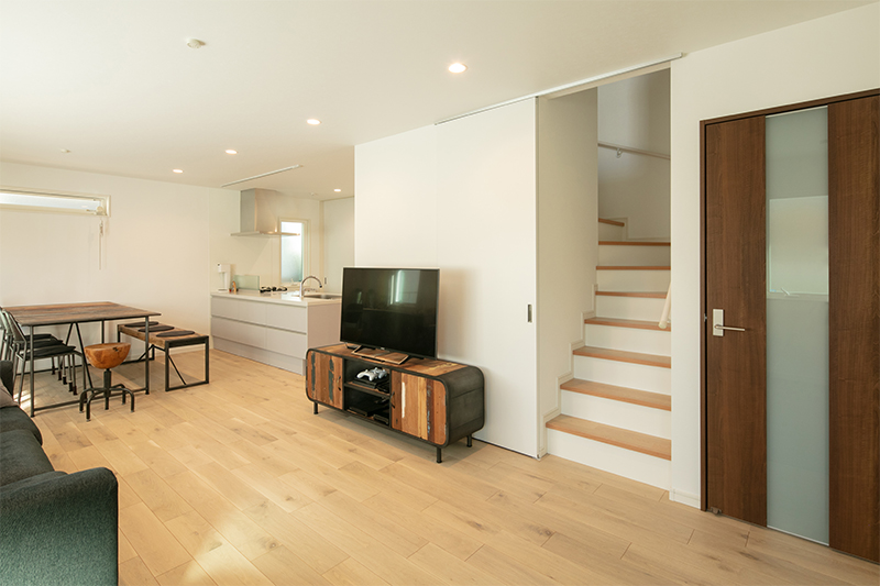 階段部分には、空気が上にいかないよう、特注の引き戸を設置。