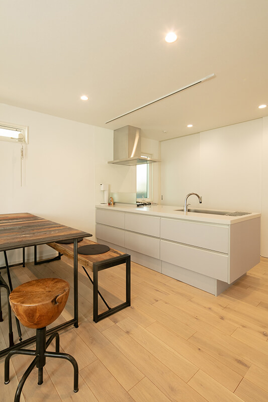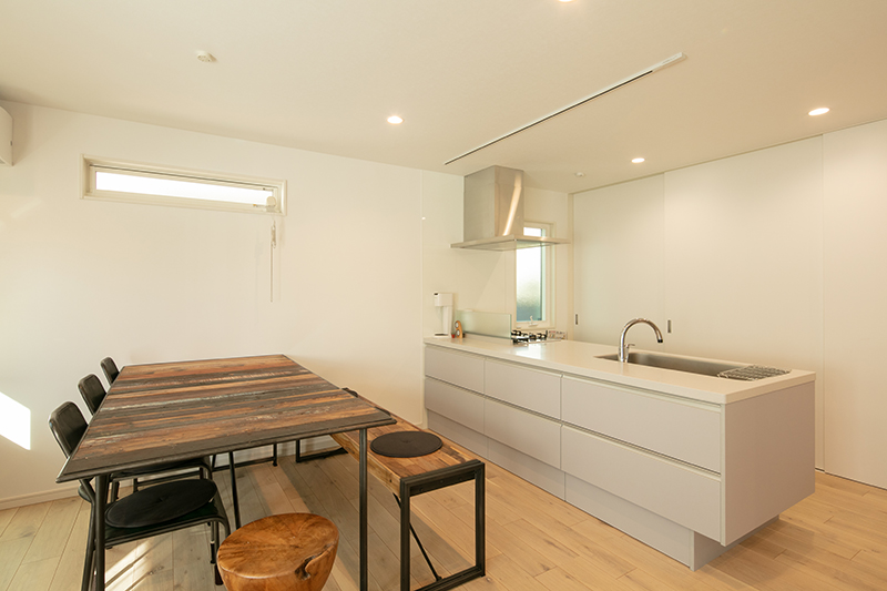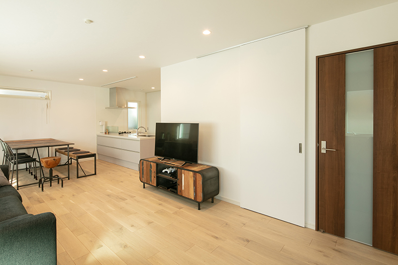 キッチン後ろには3枚特注引き戸を設置し、家電、食器、食材などを全て収納できるスペースを設けました。