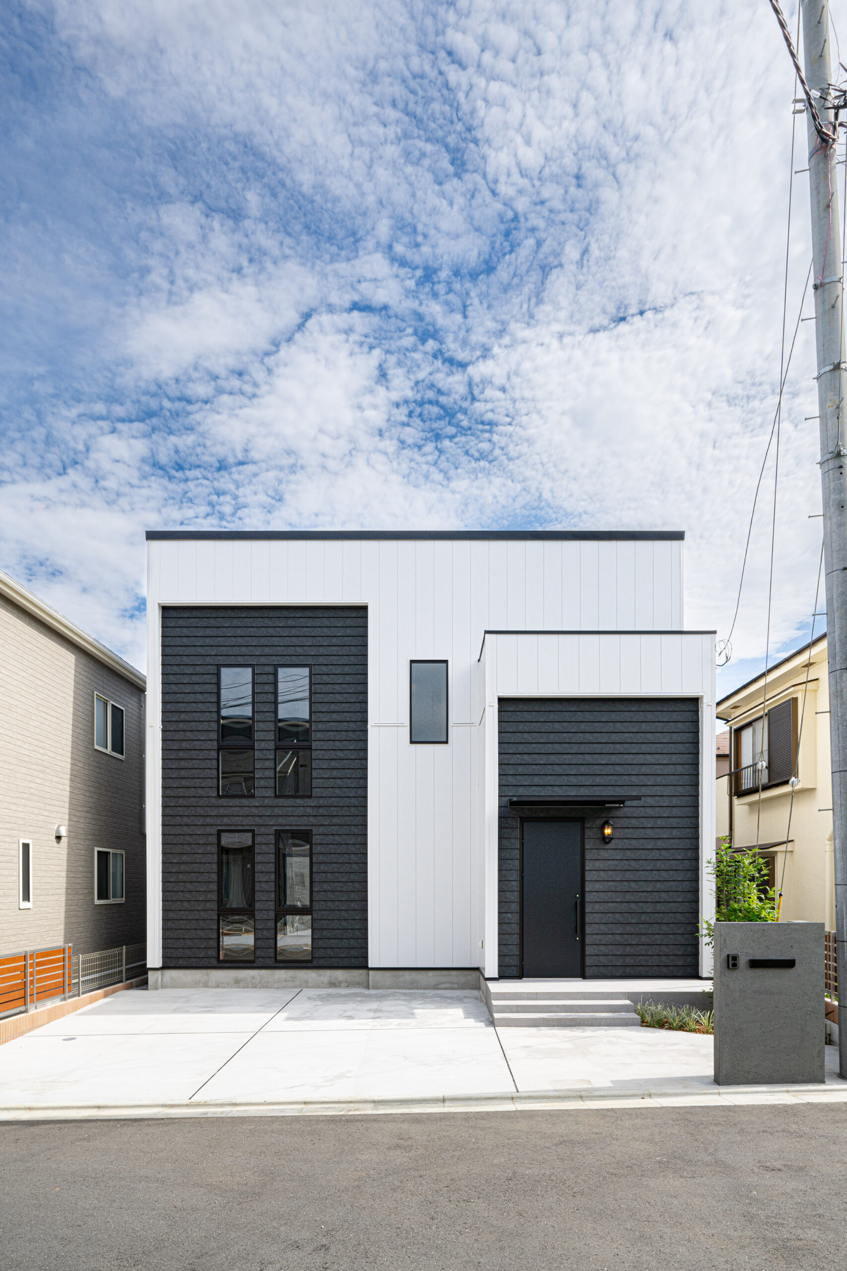 外観はモノトーンカラーでモダンな印象に。ホワイトの外壁は縦ラインのガルバサイディング、ブラック部分は横ラインのラップサイディングを採用し、メリハリをつけています。
