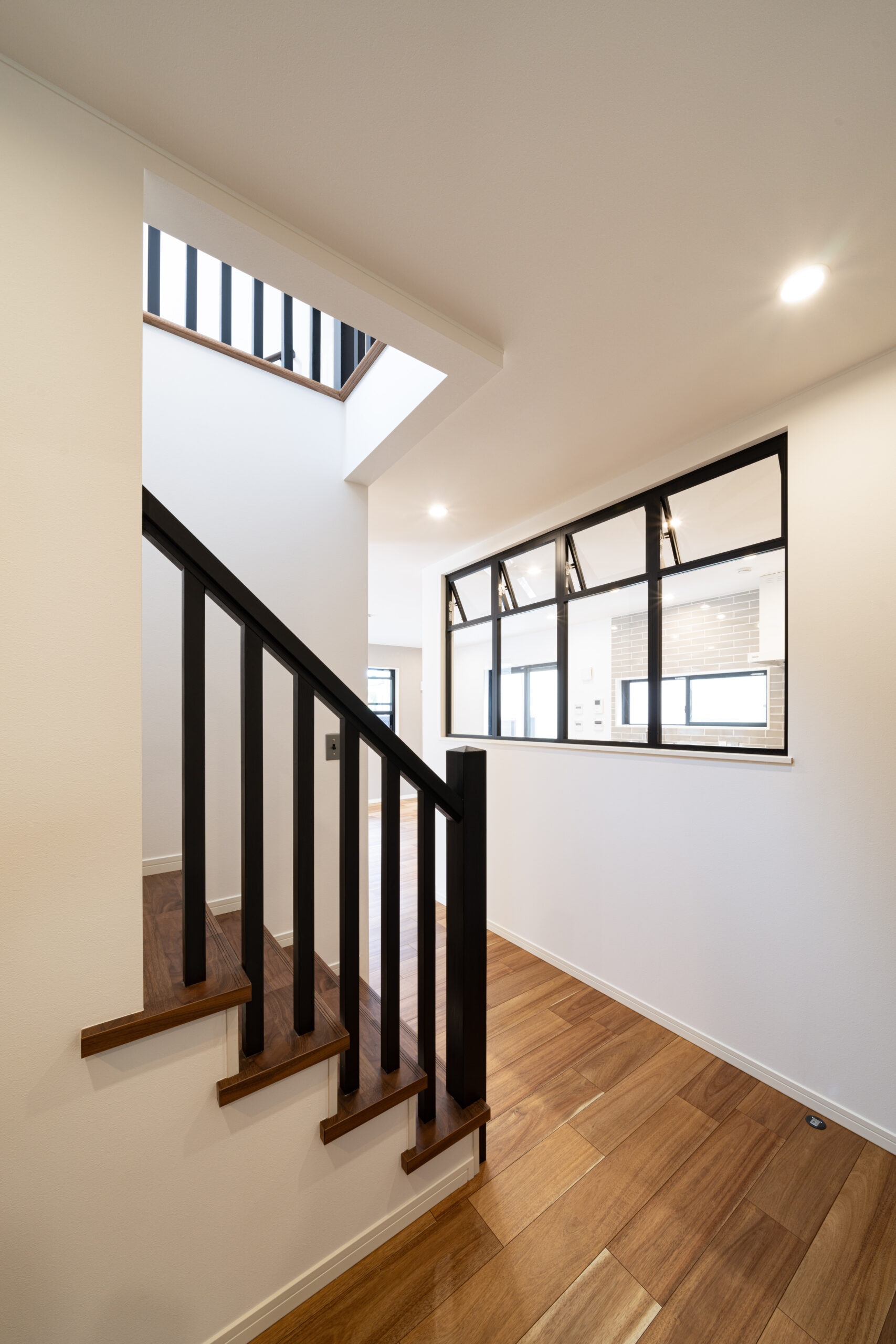 廊下には室内窓を設置。インテリアの装飾性が増すだけでなく、廊下の明るさや通風性もアップします。窓枠を階段の手すりと同じくブラックにし、インテリアにまとまりを演出した点もポイントです。