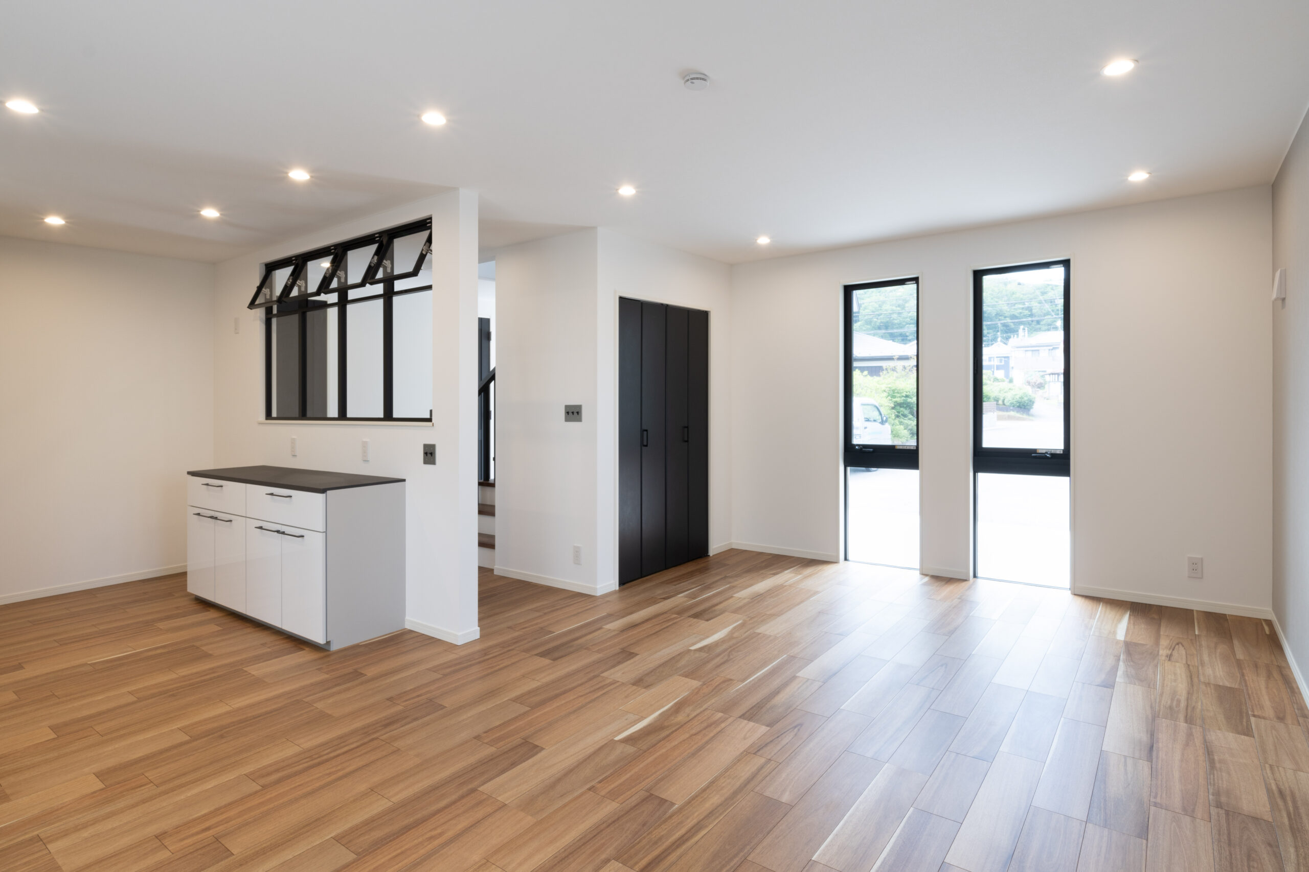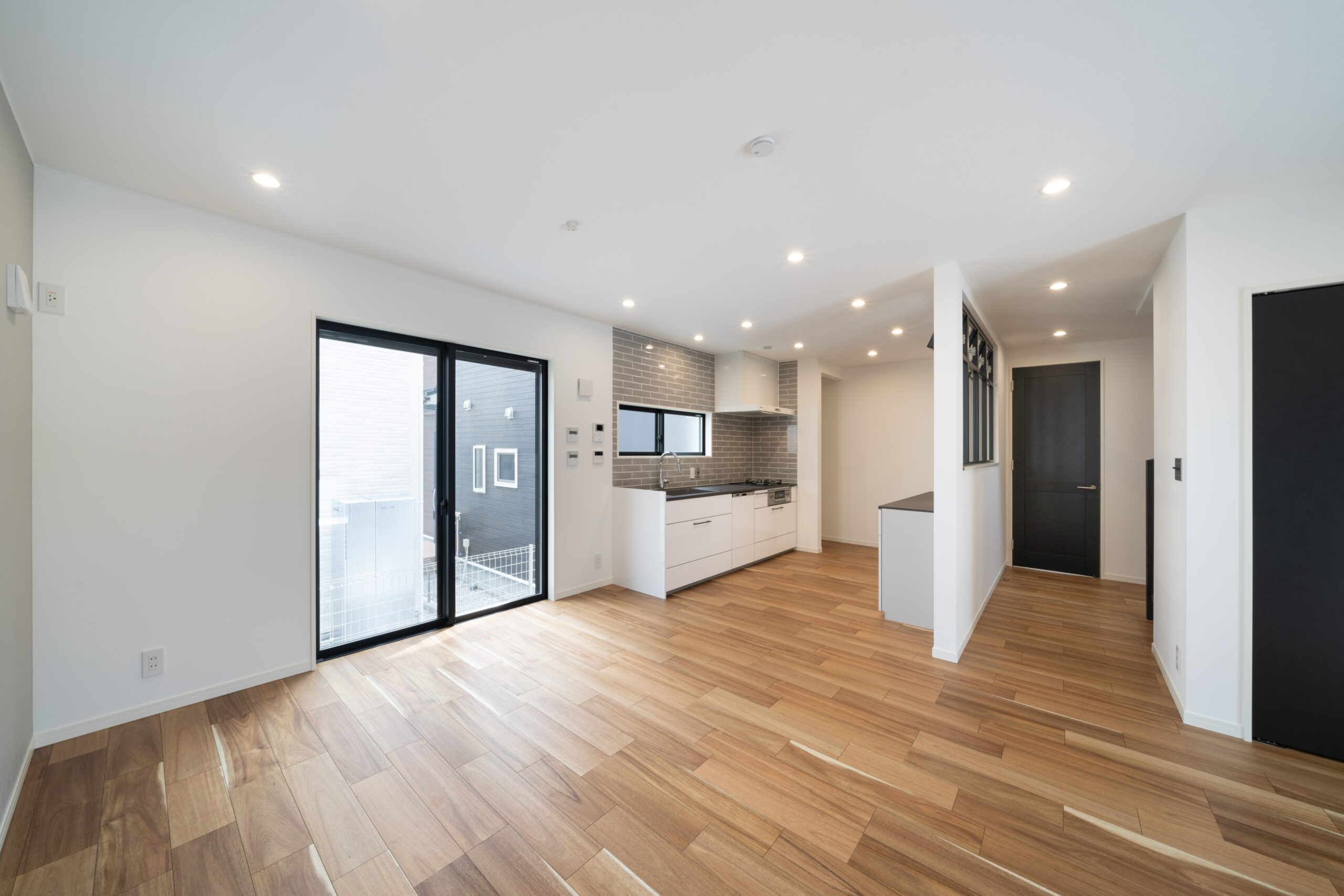LDKの床材はアカシアの突板フローリングを採用。木の質感が温かみと落ち着きを演出します。建具のブラックカラーはアクセントとなり、インテリア全体を引き締めています。