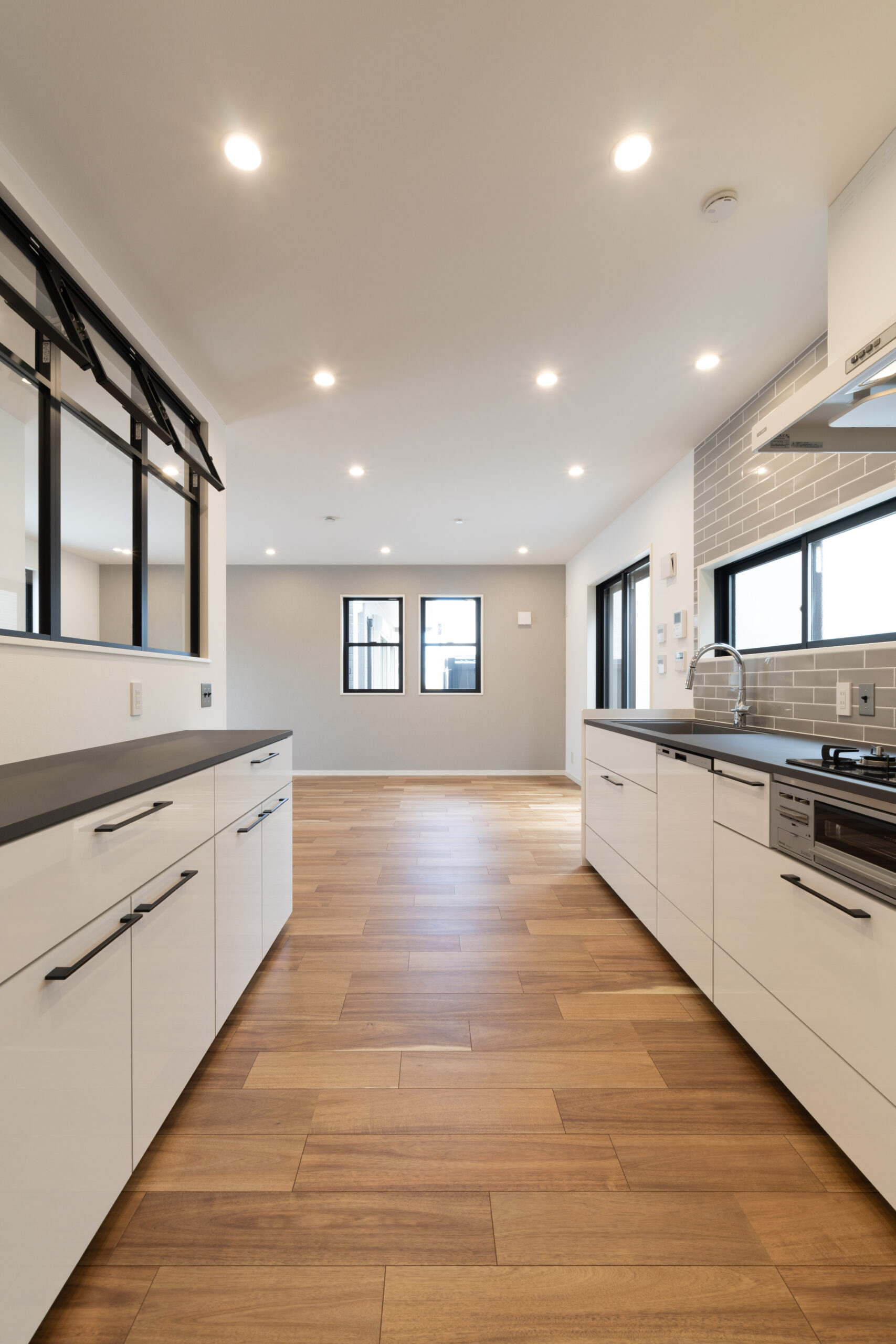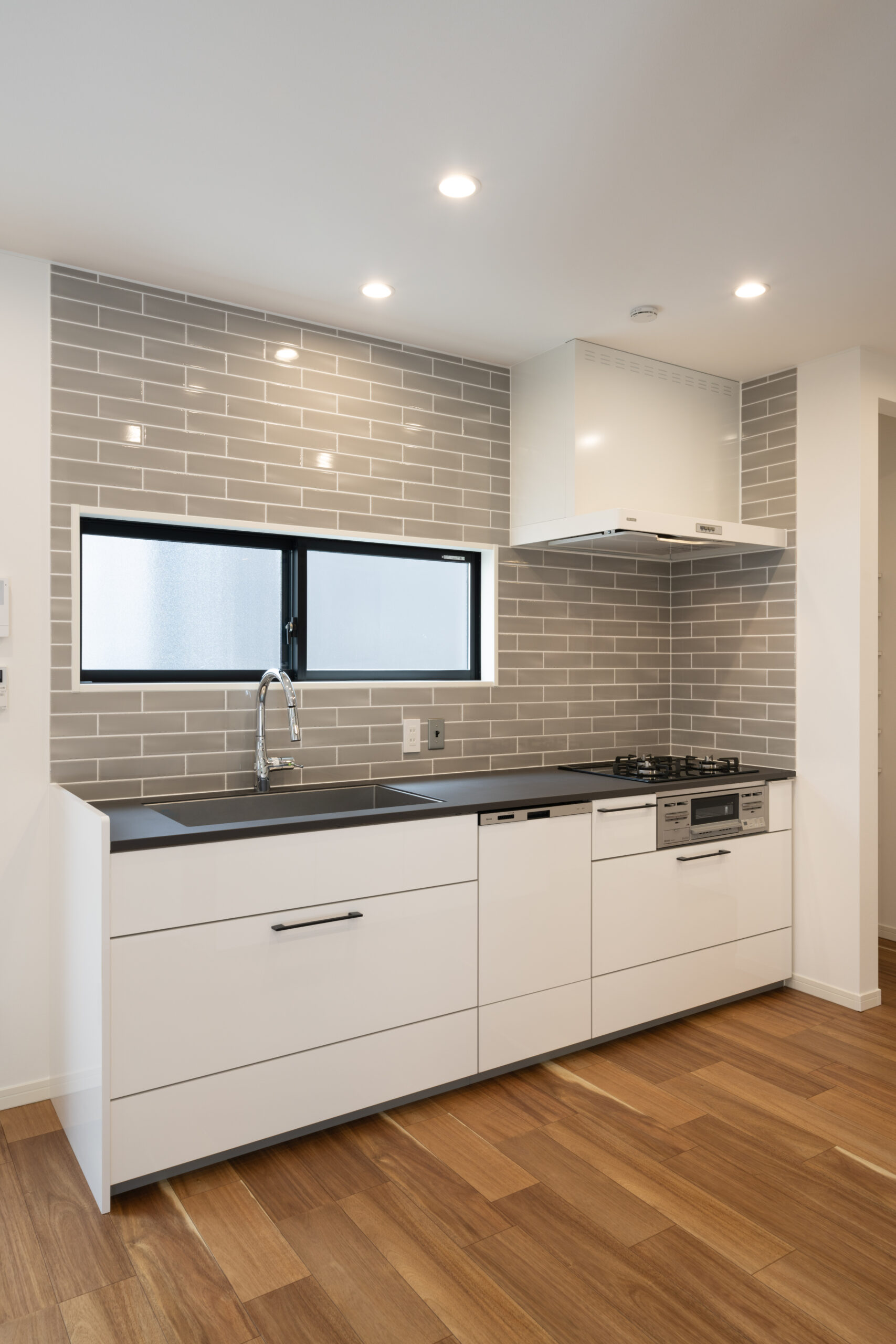 キッチンもこの家のテーマに合わせて、ホワイトとブラックのモノトーンカラーで統一。グレーのサブウェイタイルが、クールな雰囲気に温かさを加えています。