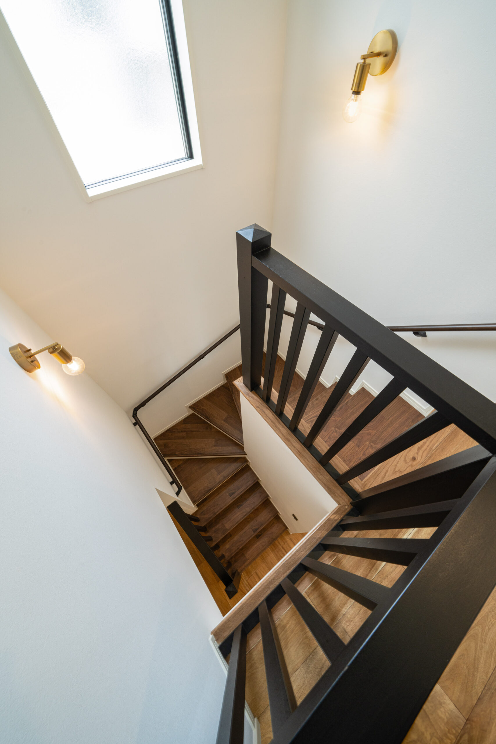 階段には黒い格子手すりを設置し、リッチなイメージに。クラシカルな印象のゴールドの照明が、ホテルライクな雰囲気を演出します。