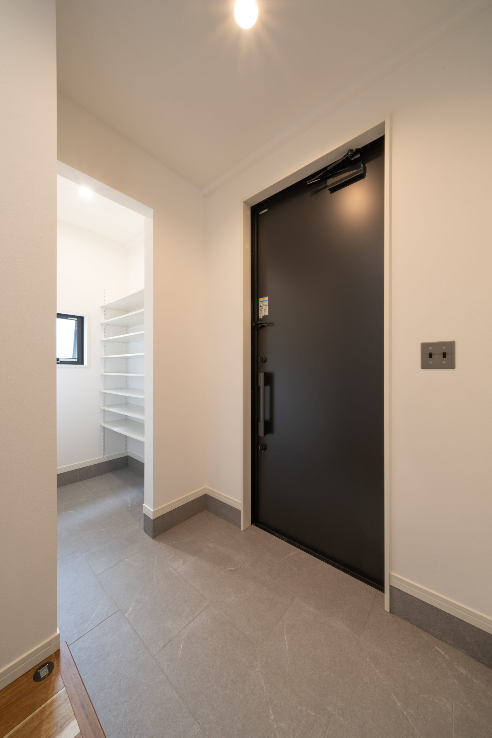 玄関の土間部分には、グレーのタイルを採用しました。クールな玄関インテリアに溶け込むよう、スイッチのデザインにもこだわっています。シューズクロークは広さを確保しており、靴や日用品などをたっぷり収納できます。