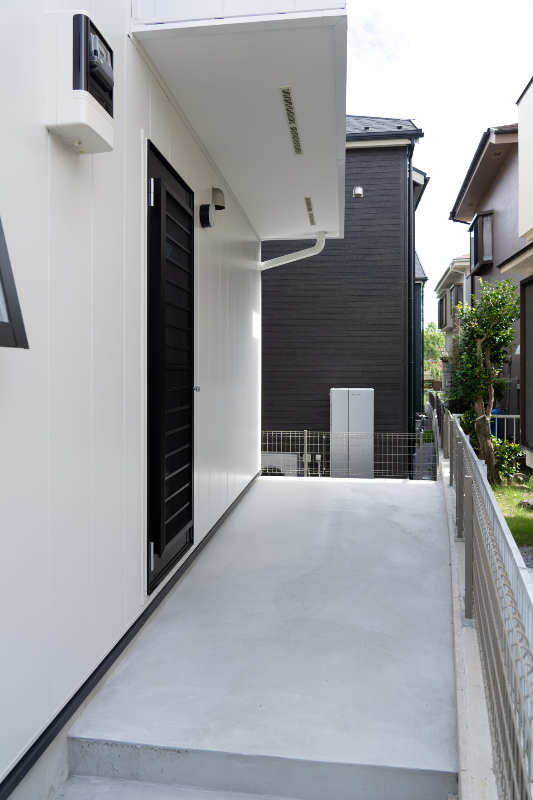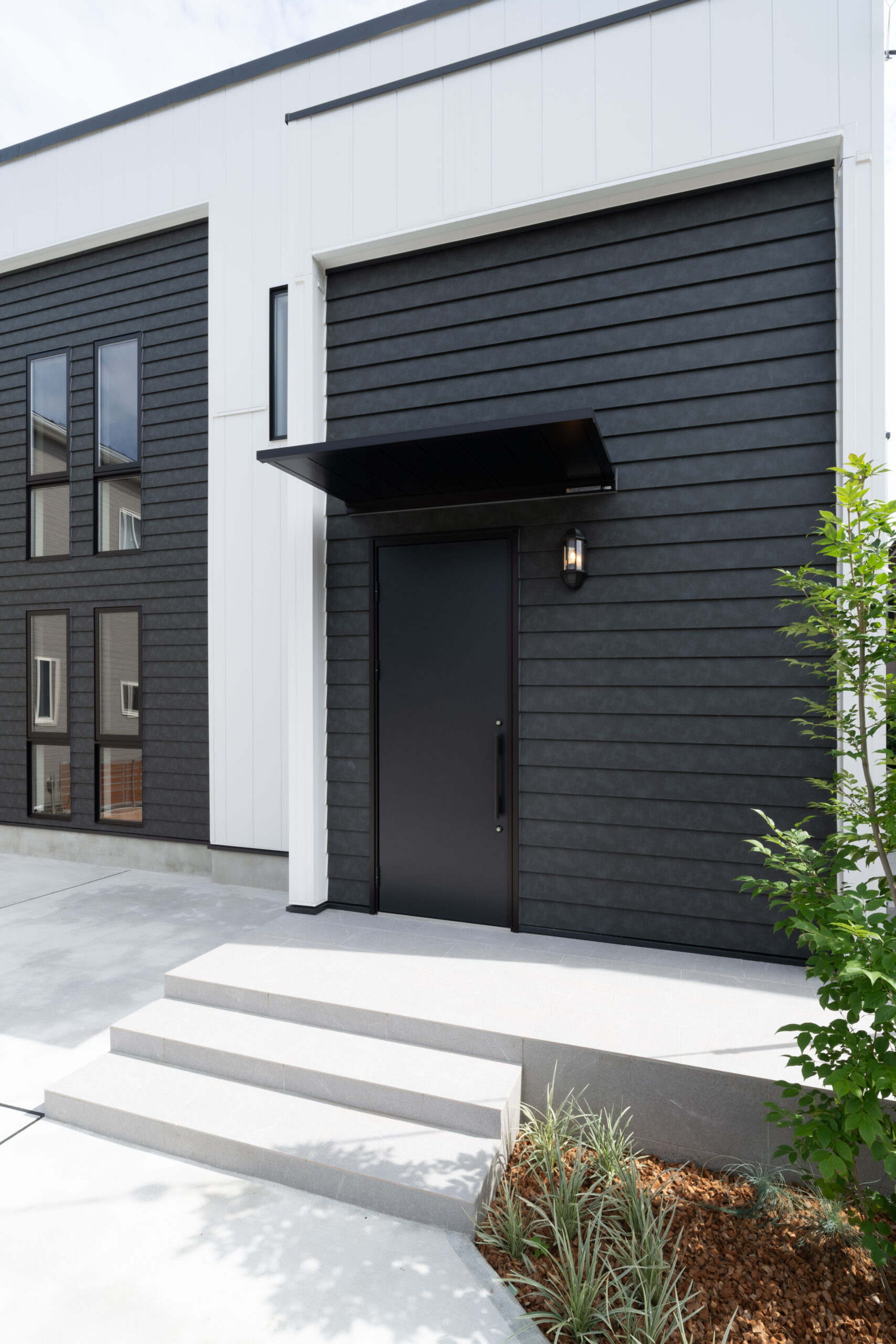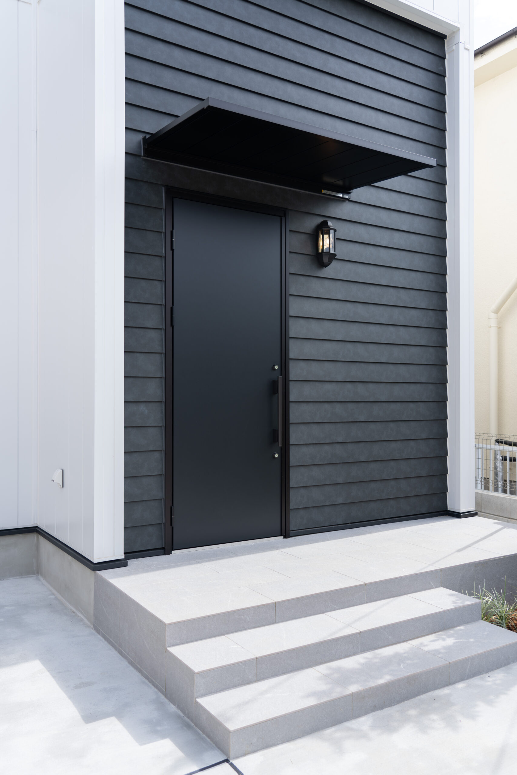 玄関は外壁に溶け込むように、ブラックのフラッシュドアを設置しています。庇も同色にすることで、統一感を演出。横に取り付けられたランプもシンプルなデザインで、洗練された玄関周りです。
