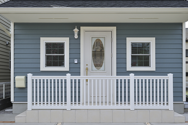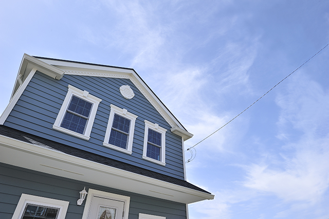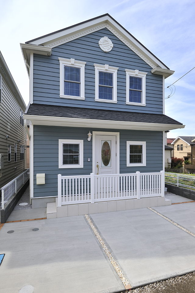ブルーの東レラップサイディングと、白い窓枠が調和する、アーリーアメリカンスタイルの住宅です。