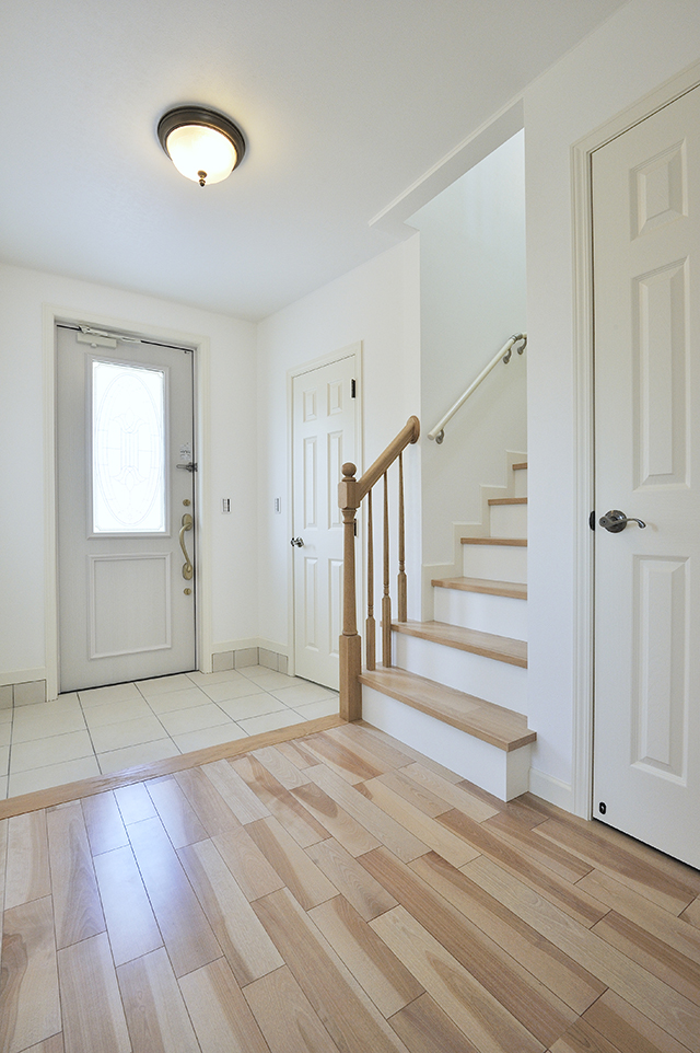 白で統一したエントランスホールには清潔感があふれます。右のドアの奥には1帖分のシューズクロークがあります。