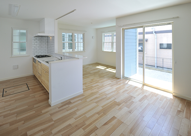 キッチンの存在感がきわだつ、広々した約16帖のリビングルームです。