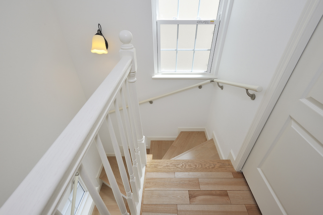 2階からみた階段部分です。白い壁にナチュラルなフローリングがやさしい雰囲気を醸し出しています。