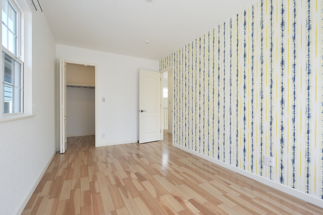 子供部屋のひとつ。ブルーとイエローを組み合わせたクロスが印象的で、明るい部屋を演出します。