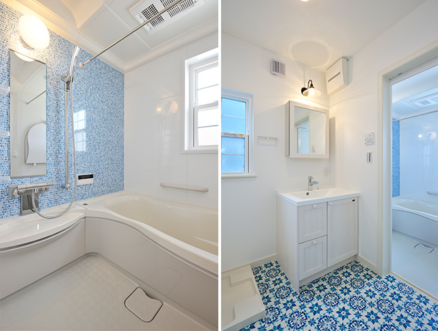 左:バスルームです。ブルーのタイルが涼しげで、入浴の時間をもっと楽しく。