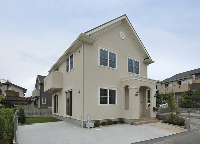 濃いクリーム色をベースにピンクとグレーを配合した、優雅な佇まいの外観。外壁は海外で調合した塗料を取り寄せて施工しました。