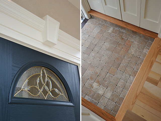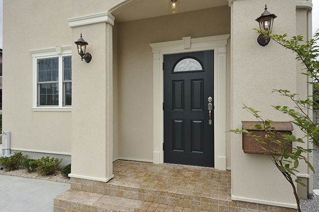 玄関扉は重厚感のあるネイビーグレー。玄関扉の周囲の飾りはFYPON(ファイポン)社製輸入部材を使用し、アプローチから玄関の床は大理石のモザイクタイルを使用しています。