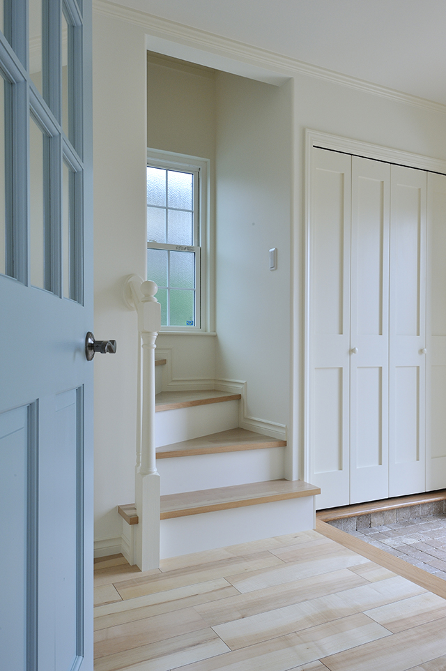 白を基調とした玄関ホール。さわやかさを感じさせる水色の扉はリビングへ続いています。建具は既製品ではなく、現場での塗装を行っています。