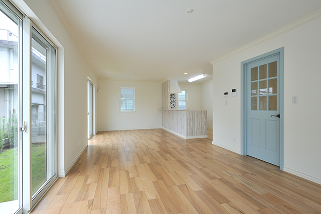 南側から陽射しがさしこむ、明るいリビングルームです。水色の扉が部屋全体をやんわり引き締めるアクセントになっています。