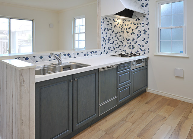 輸入キッチンを採用しています。深みのある濃いブルーで落ち着いた雰囲気に。上部のタイルは色の組み合わせが自由なコラベルタイル。ブルー系2色とホワイト3色の5色の組み合わせをチョイスして、キッチンの色と合わせました。