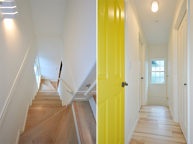 階段ホールと2階廊下部分です。使われている窓は、すべてクレトイシ社の樹脂断熱サッシ。ポップなイエローの扉はトイレの扉で、インパクト大。