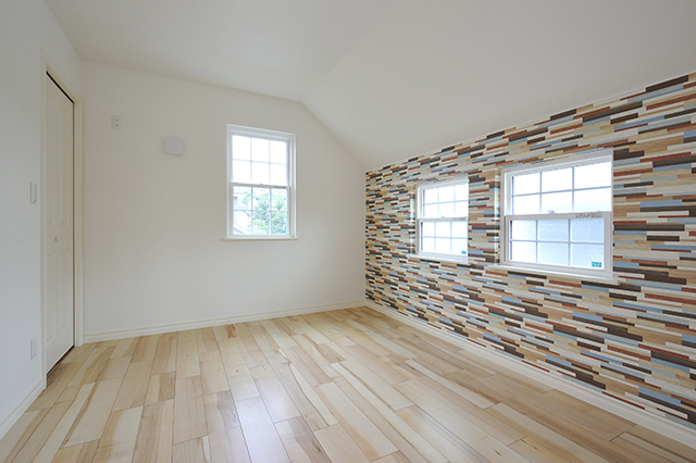 もうひとつの子供部屋。目を引くアクセントクロスを壁の一面だけに貼っています。
