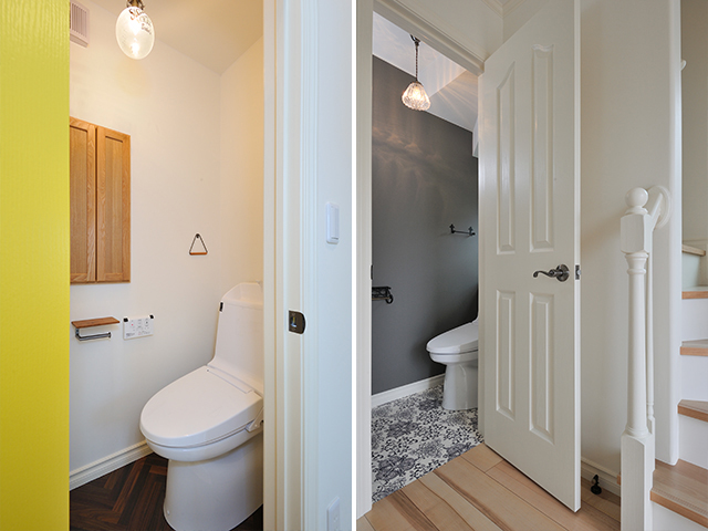 2階、1階それぞれにあるトイレです。1階トイレの床はマヨリカタイル調のクッションフロア。両室とも照明に凝っています。