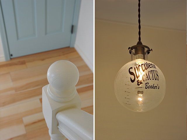 丸みのある白い階段部分の手すりや、遊び心のある照明など、こだわりが随所につまっています。