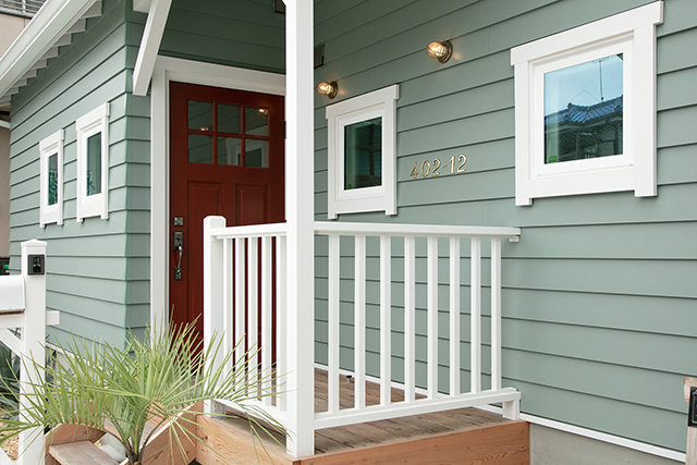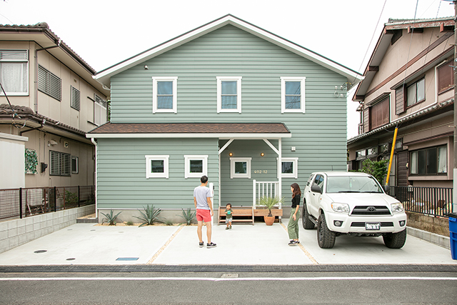 玄関のある北側の外観です。サーファーズハウスらしいラップサイディングがご希望で、色はサンプルを見てすぐにグリーンに決まりました。