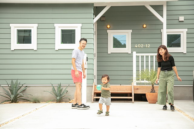 玄関のカバードポーチの前でボール遊びをするS様ご家族。4つ並べた正方形の窓がポイントです。