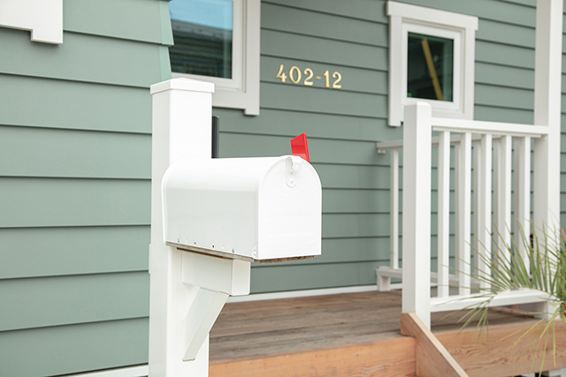 カバードポーチの柱や小柱は、レッドシダー材をホワイトに塗装して仕上げています。ポストの支柱はメンテナンスを考慮して、樹脂製の支柱を採用しています。