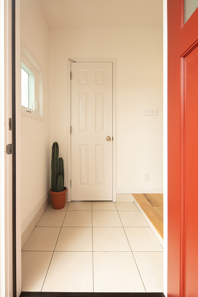 玄関ドアを開けると、正面に白い扉。扉の向こうはシューズクロークになっています。白いドアの右側のスイッチにご注目を。