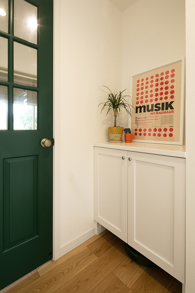 玄関ホールを進むと、リビングに入るドアがあり、こちらはシックな深緑色に塗装しました。白い扉の棚の下はルンバの収納スペースになっています。