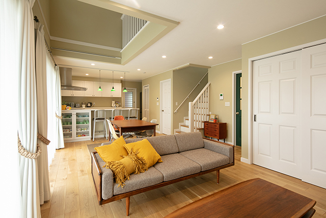 吹き抜けのあるS様邸のリビング。クロス(壁紙)は、緑の入ったベージュを選択。この色は、家づくり当初からの奥様のご希望で、白く塗装した建具が、緑が入ったベージュによって引き立っています。