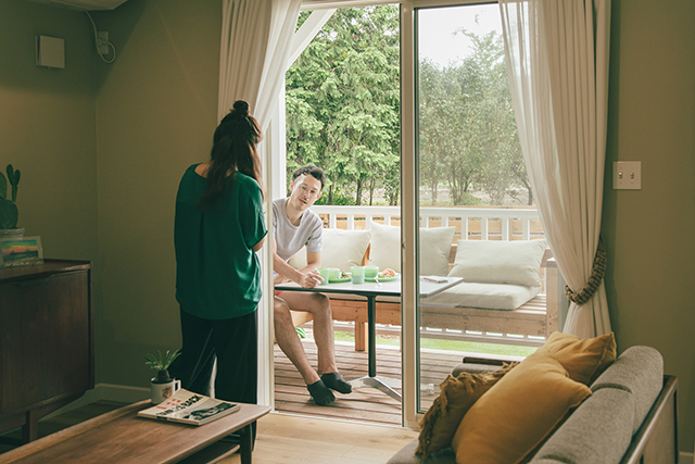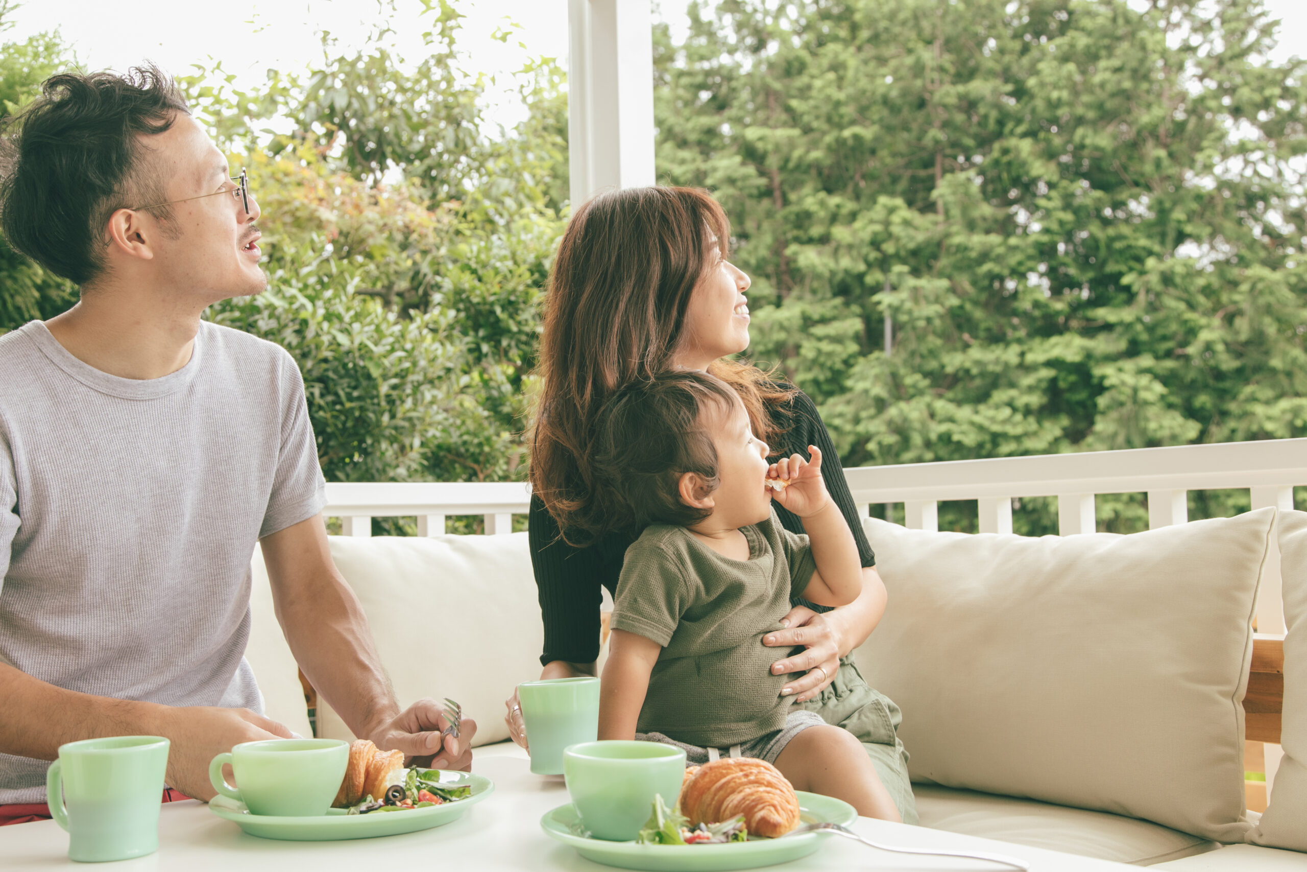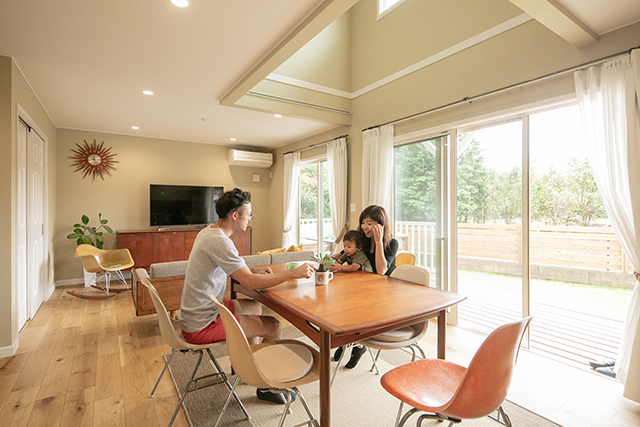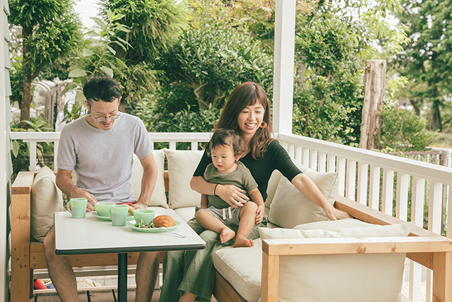 ランチを楽しむS様ご家族。緑に囲まれた自宅で過ごす、お気に入りの時間のひとつです。