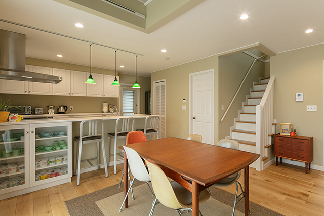 ダイニングスペースです。キッチンカウンターの下には、趣味で集めているアメリカ製のマグカップを収納する食器棚を造作しました。