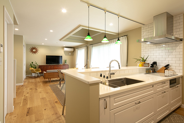 ウッドワン社製の框戸(かまちど)タイプのシステムキッチン。無塗装品を仕入れ、建具と同じホワイトの塗料を塗って統一感を出しました。
