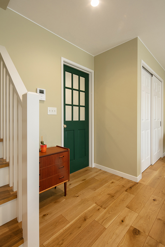 深緑のドアが家のさりげないアクセントになっています。たっぷりの収納も快適な暮らしをサポートしてくれます。