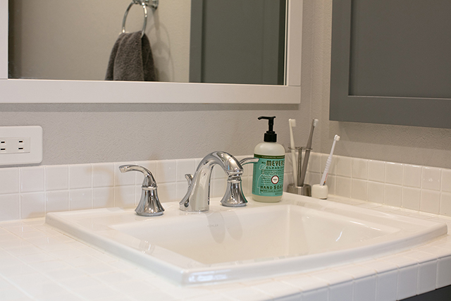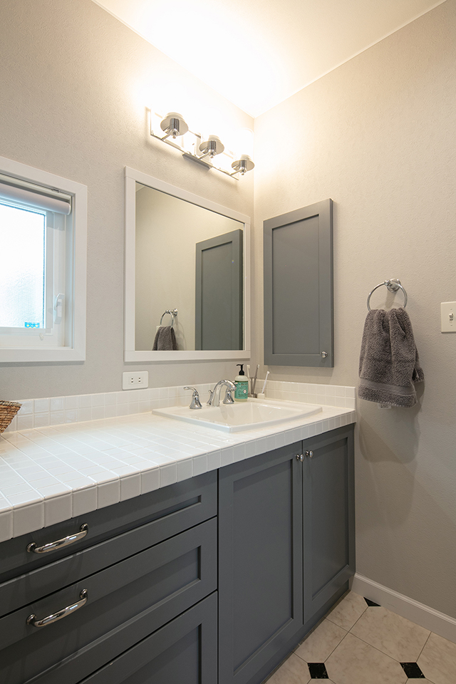 洗面室です。洗面台は造作しています。天板には白いタイルを使用しました。洗面台のキャビネットの色は、家づくり当初からグレーに決められていました。