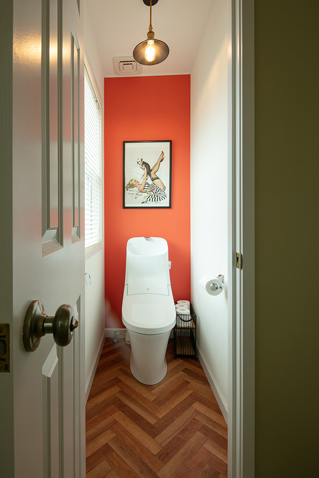2階のトイレです。床材にはクッションフロアーを使用しています。オレンジのポイントクロスがおしゃれなアクセントになっています。