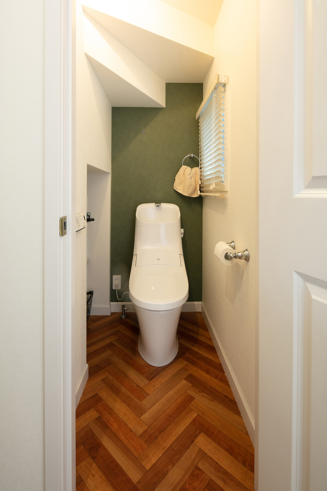 1階のトイレです。2階とはまた違った雰囲気で、深緑のポイントクロスが印象的です。